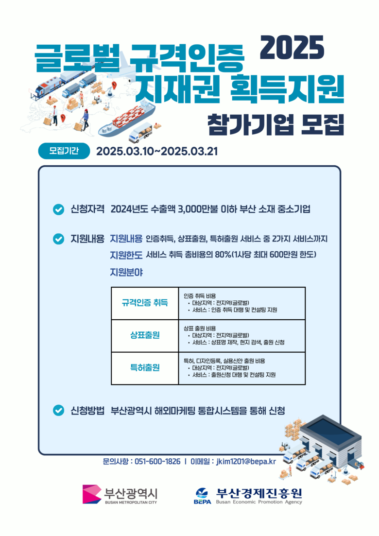 ◈ 사업 참여를 희망하는 기업은 3.21.까지 시 해외마케팅 통합시스템을 통해 신청하면 돼 [부산 세계타임즈=이용우 기자] 부산시(시장 박형준)와 부산경제진흥원(원장 송복철)은 지역 중소기업의 수출품에 대한 해외규격인증 취득과 지식재산권 확보를 위한 지원사업을 확대 추진한다고 밝혔다.