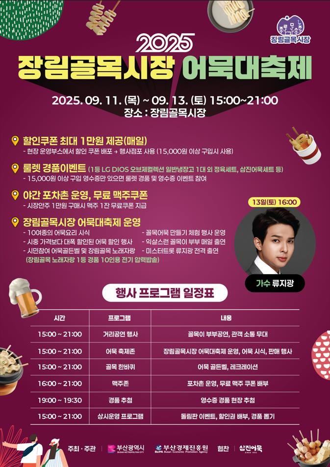 문화·참여 프로그램도 다채롭게 진행된다. ▲해학과 장단이 어우러진 ‘꼴목이 부부 공연’의 시장 순회공연 ▲미스터트롯 출신 유명 가수의 특별 무대가 축제 분위기를 고조시킨다. ▲주민들이 직접 참여하는 ‘장림골목시장 노래자랑’은 지역 공동체가 함께 어울리는 시간을 제공하며, 다양한 경품도 지급돼 현장의 열기를 더한다.