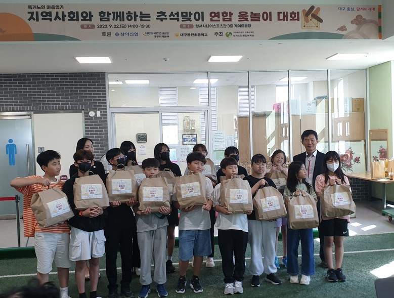 [대구 세계타임즈=한성국 기자] 대구용전초등학교(교장 배영서)는 2023년 9월 22일(금) 1교 1기부 봉사동아리 14명의 학생들이 추석을 맞이하여 성서노인복지관에서 「지역사회와 함께하는 행복취약계층 마음피트니스 대화기부사업 마음나누기」에 참여해 지역 어르신들과 소통의 시간을 보내고 80만원 상당의 추석 지원물품을 전달했다고 밝혔다.