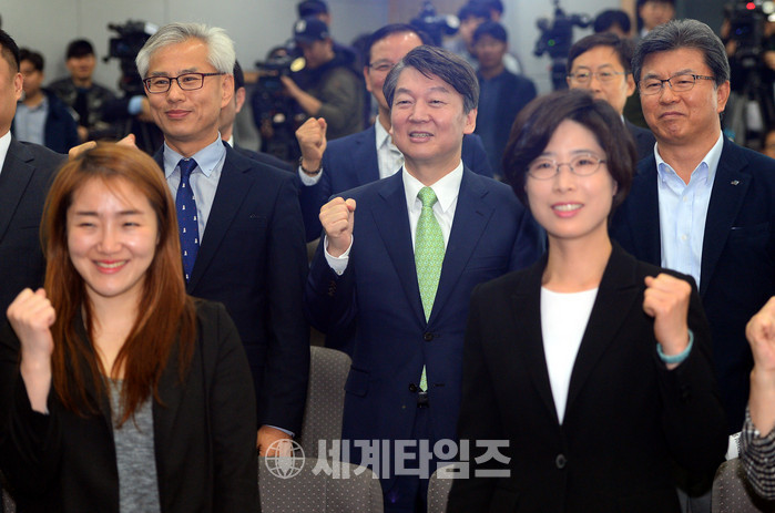 안철수 국민의당 대선후보가 18일 오전 대전시 유성구 카이스트에서 열린 과학기술인과의 대화에서 참석자들과 파이팅을 외치고 있다. 2017.04.18.