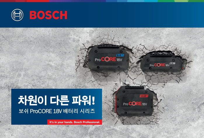 보쉬는 충전 공구의 핵심인 배터리 기술 개발에 지속적으로 힘써 유선 공구에 버금가는 파워를 제공하면서도 인체공학적 그립감과 경량 콤팩트화를 동시에 실현하며 배터리의 새로운 기준을 제시하고 있다. 보쉬 18V 충전 공구와 높은 시너지 효과를 내는 프리미엄 배터리 프로코어 (ProCORE18V Professional) 시리즈 (4.0Ah, 8.0Ah, 12.0Ah)는 최신 셀 기술과 최상의 발열 관리로 강력한 성능을 발휘하고, 차원이 다른 파워를 제공한다.