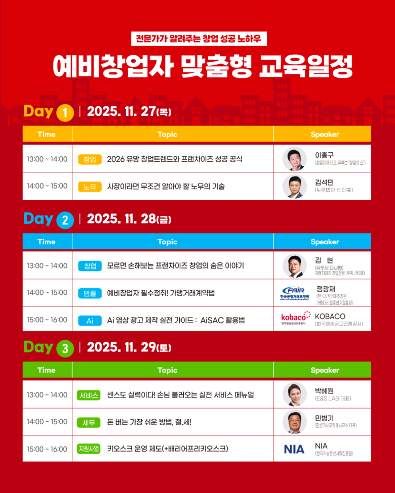 마지막 날인 29일에는 ▲박혜원 이엔에스 랩(E&S LAB) 대표가 ‘센스도 실력이다! 손님 불러오는 실전 서비스 매뉴얼’ ▲민병기 민병기세무회계사무소 대표의 ‘돈 버는 가장 쉬운 방법, 절.세!’ ▲한국지능정보사회진흥원에서 ‘키오스크 운영제도(+배리어프리키오스크)’를 주제로 강의를 진행한다.