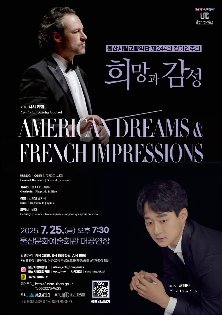 이번 무대는 울산시립교향악단 예술감독 사샤 괴첼 지휘자가 지휘봉을 잡고, 정교하고 감미로운 감각의 세계적인 피아니스트 서형민의 협연으로 꾸며진다.