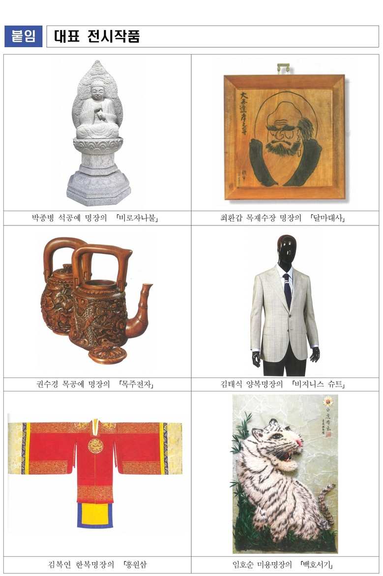 박종병 석공예 명장의 ‘비로자나불’, 최환갑 목재수장 명장의 ‘달마대사’, 권수경 목공예 명장의 ‘목주전자’, 김태식 양복 명장의 ‘비지니스 슈트’, 김복연 한복 명장의 ‘홍원삼’, 임호순 미용 명장의 ‘백호서기’ 등 전통문화를 계승한 재현 작품부터 현대 감각에 맞게 제작한 명품까지, 명장들의 과거와 현재를 아우르는 숭고한 장인정신과 인내의 숨결을 감상할 수 있다.