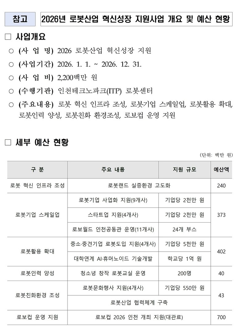 이번 사업은 로봇기업의 성장 지원은 물론, 대학과의 산학협력 강화와 로봇 문화 확산 등 산업 생태계 전반을 아우르는 지원을 위해 마련됐다. 사업 운영은 인천테크노파크가 전담해 세부 사업을 체계적으로 추진하고, 기업 밀착 지원을 수행할 예정이다.
