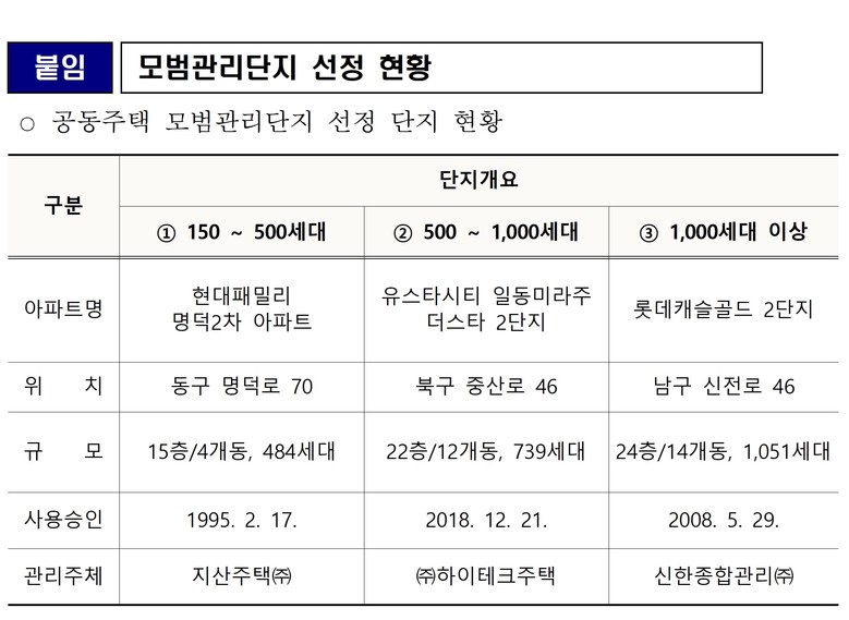 이후 모범관리단지 선정위원회의 현장 확인 및 서류 평가 등을 거쳐 총 3개 단지를 모범관리단지로 선정했다.