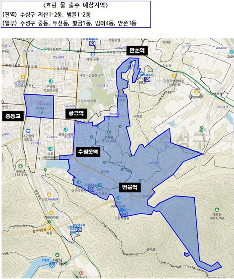 이번 수계조정으로 6월 11일(수) 22시부터 다음날 06시까지 지산1·2동, 범물1·2동 전부 및 중동, 두산동, 황금1동, 범어4동, 만촌3동 일부 지역 3만 세대에서 흐린 물이 나올 수 있다.