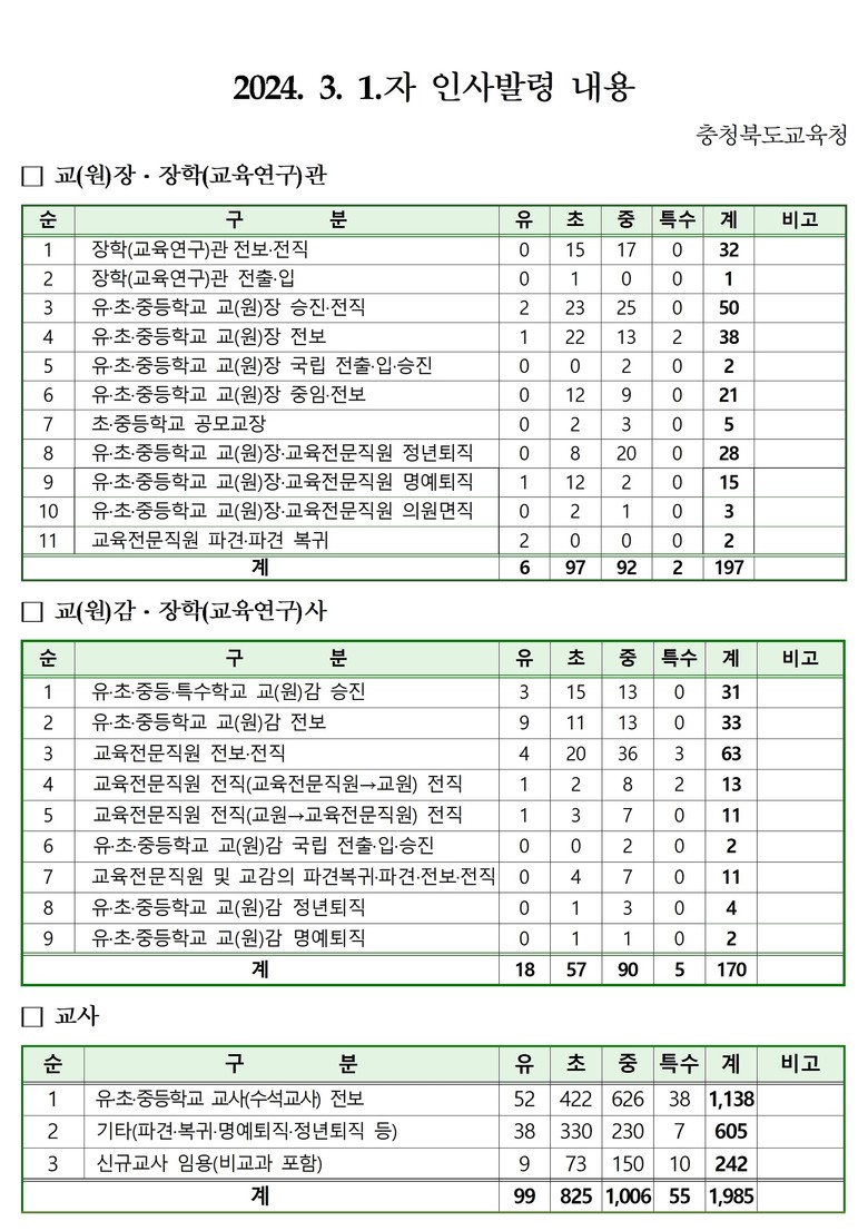 [충북 세계타임즈=이현진 기자] 충청북도교육청(교육감 윤건영)은 2일(금), 2024년 3월 1일자 유‧초‧중등‧특수학교의 교(원)장, 교(원)감, 교육전문직원, 교사 2,352명에 대한 인사를 단행했다.