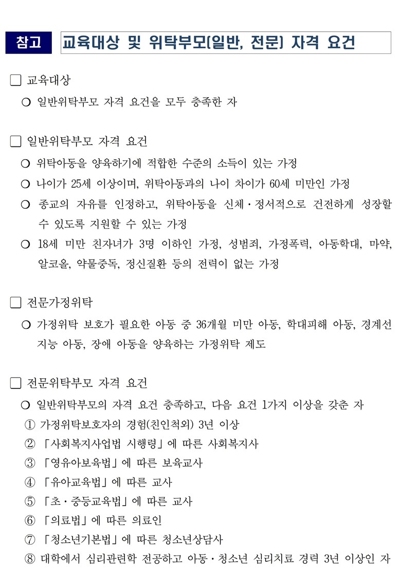 대구시는 아동이 가정적인 분위기에서 건전한 사회인으로 성장할 수 있도록, 위탁부모를 양성하고 건전한 위탁가정을 모집하기 위한 예비위탁부모 양성교육을 매월 실시한다.