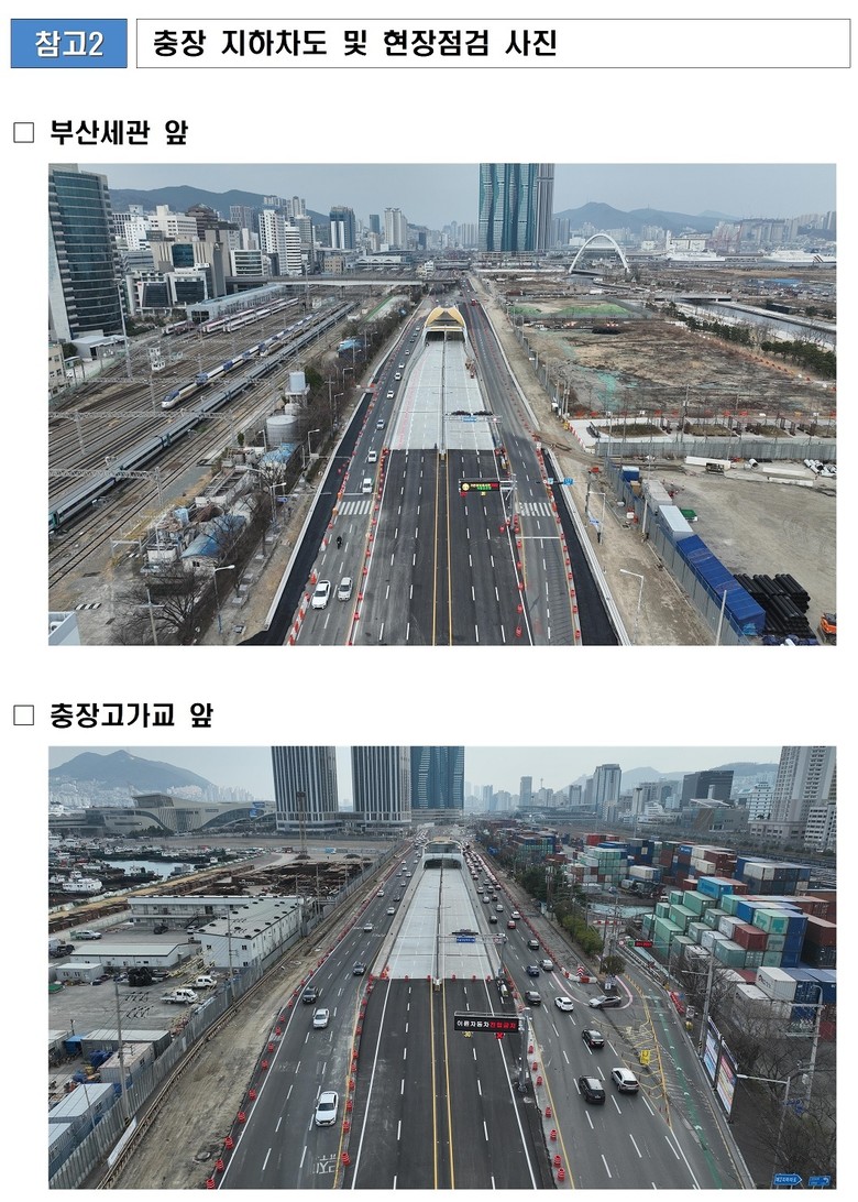 특히, 지하차도를 이용할 때 ‘충장고가교 종점부’와 ‘부산세관’ 사이의 주요 교차로(3부두・4부두 교차로) 2곳을 정차 신호 없이 지하로 통과하게 되어 해당 구간 통과 시간이 대폭 단축될 것으로 전망된다.