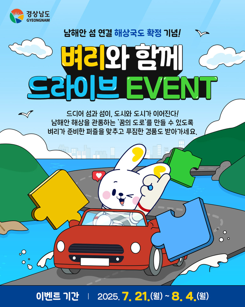 경남도는 도민이 직접 정책을 체험하며 참여할 수 있도록, 이벤트 페이지를 통해 경남 홍보캐릭터 ‘벼리’와 함께하는 퍼즐 게임 형식의 콘텐츠를 선보인다. 참여자는 국도 5호선 통영~남해 43km 구간을 퍼즐로 완성하면서, 해상국도의 전체 구상을 자연스럽게 이해할 수 있도록 구성했다.