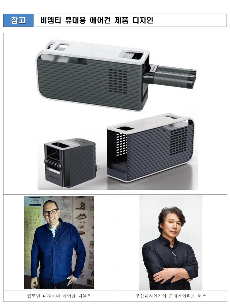 나이키(Nike)와 구글(Google) 등 글로벌 브랜드 프로젝트를 수행한 산업디자이너 마이클 디툴로(Michael DiTullo)와 부산의 기술기업 ㈜비엠티, 부산디자인기업 크리에이티브퍼스가 공동으로 진행한다. 세 주체는 캠핑용 휴대용 에어컨 ‘파워쿨 핸디맥스’의 디자인 혁신 결과물을 완성했다.