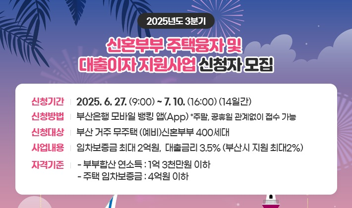 지원 대상은 신청 시작일(2025.6.27.) 기준 부산시에 주민등록이 돼 있는 신혼부부(혼인신고일 기준 7년 이내) 또는 예비 신혼부부(혼인 예정 3개월 이내)이며, ▲부부합산 연소득 1억 3천만 원이하 ▲임차보증금 4억 원이하의 주택(아파트 포함) 및 주거용 오피스텔 ▲신청기간 종료일 전일(2025.7.9.)까지 확정일자부 임대차계약서 체결 등의 요건을 충족해야 한다.