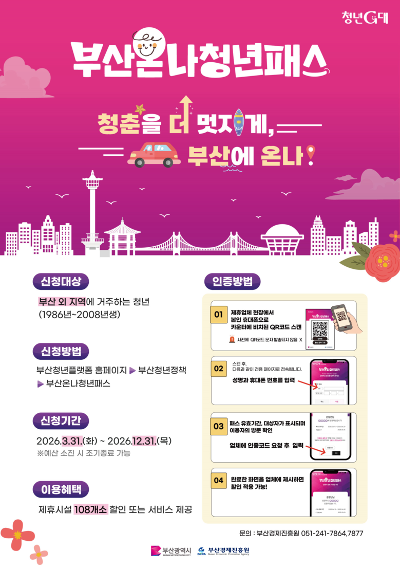 부산을 방문한 다른 지역 청년들은 「부산온나청년패스」로 부산의 대표적인 관광시설과 지역업체를 이용하여 실질적 할인 혜택을 받을 수 있으며, 할인은 내일(31일)부터 예산 소진 시까지 적용된다.