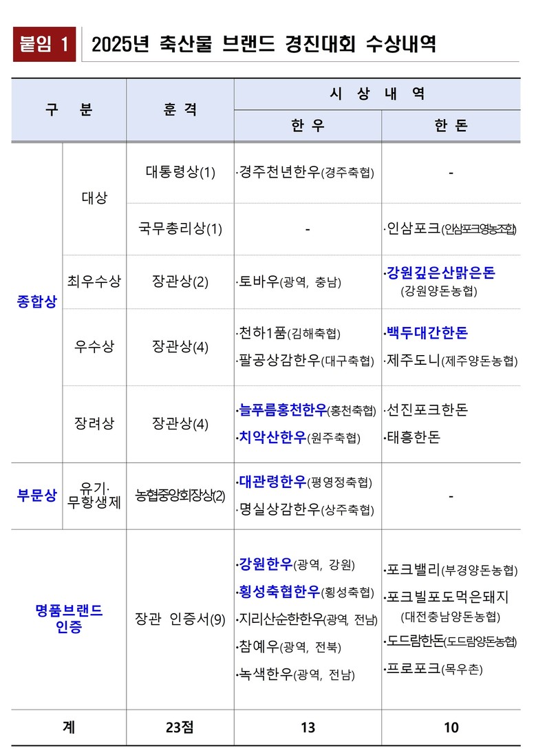 세부 수상 내역을 보면 종합 부문에서는 ▲강원깊은산맑은돈이 최우수상을, ▲백두대간한돈이 우수상을 수상했으며, ▲늘푸름홍천한우와 ▲치악산한우가 장려상에 선정됐다. 또한 유기·무항생제 부문에서는 ▲대관령한우가 수상의 영예를 안았다.