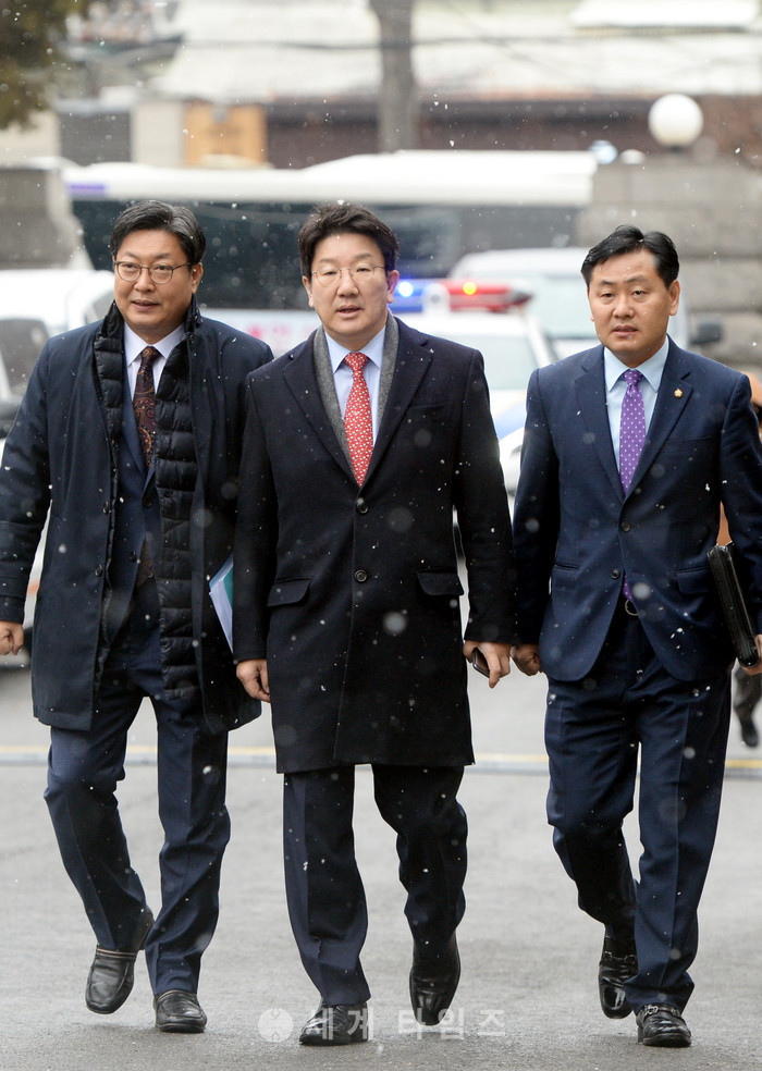 권성동(가운데) 국회 탄핵소추위원장과 위원들이 22일 오전 서울 종로구 헌법재판소에서 열린 박근혜 대통령 탄핵심판 16차 변론기일에서 참석하기 위해 대심판정으로 이동하고 있다. 2017.02.22.