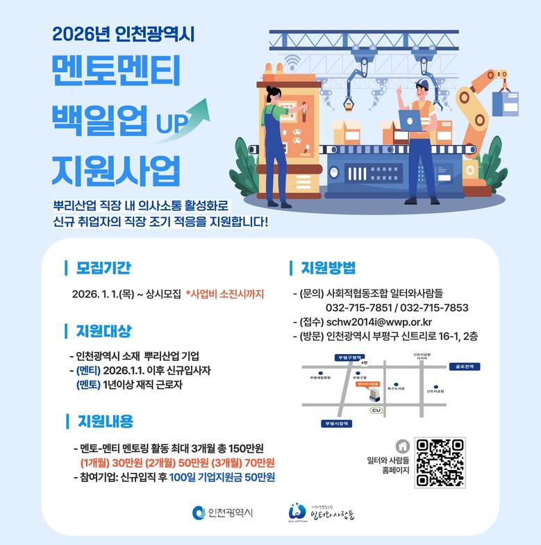 신규 입사자와 멘토로 참여하는 재직 근로자에게는 3개월간 최대 150만 원의 지원금이 지급되며, 신규 입사자가 100일 근속을 달성한 기업에는 문화·여가 활동비가 지원된다.
