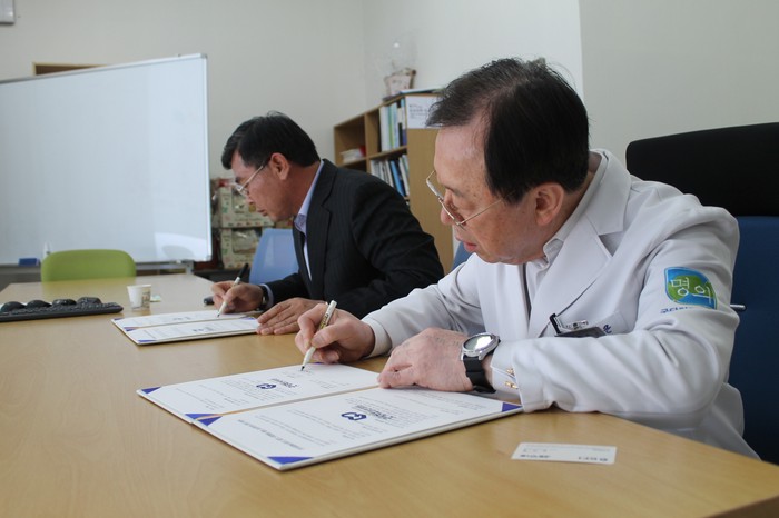 | ▲굿닥터튼튼병원 박춘근 원장(우측)과 ㈜GFI 윤성필 대표가 화재 안전에 대한 MOU 협정을 체결하고 있다. |