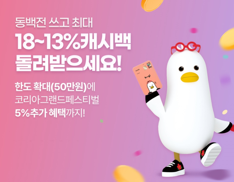 11~12월의 캐시백 요율은 9~10월과 같이 최대 13퍼센트(%)를 유지하되, ‘코리아 그랜드 페스티벌’ 기간(10.29.~11.9.)에만 한시적으로 ▲최대 18퍼센트(%) 캐시백 요율을 적용하고 ▲50만 원의 별도 한도를 추가 적용하는 것이다. 이에 따라 ‘코리아 그랜드 페스티벌’ 기간에는 50만 원 사용 시 최대 9만 원을 환급받을 수 있다.
