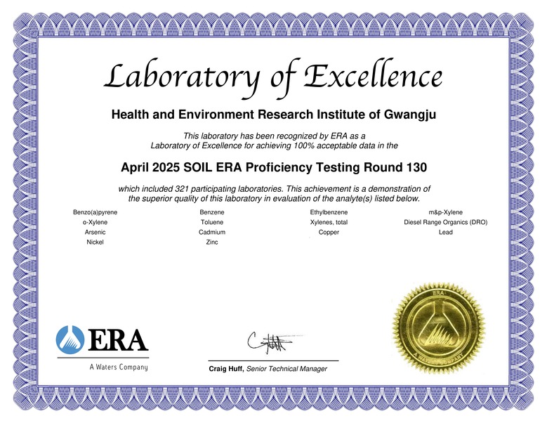 정현철 광주보건환경연구원장은 “8년 연속 국제인증 획득은 연구원의 지속적인 분석 능력 강화와 품질관리 체계 운영의 결과”라며 “앞으로도 과학적이고 신뢰도 높은 환경분석으로 시민 건강 보호와 환경 정책의 기반 마련에 기여하겠다”고 말했다.