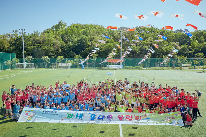 | ▲ 자생의료재단이 주최한 꿈나무 올림픽에 참가한 자생의료재단 임직원, 자원봉사자, 아이들이 사진촬영을 하고 있다. |