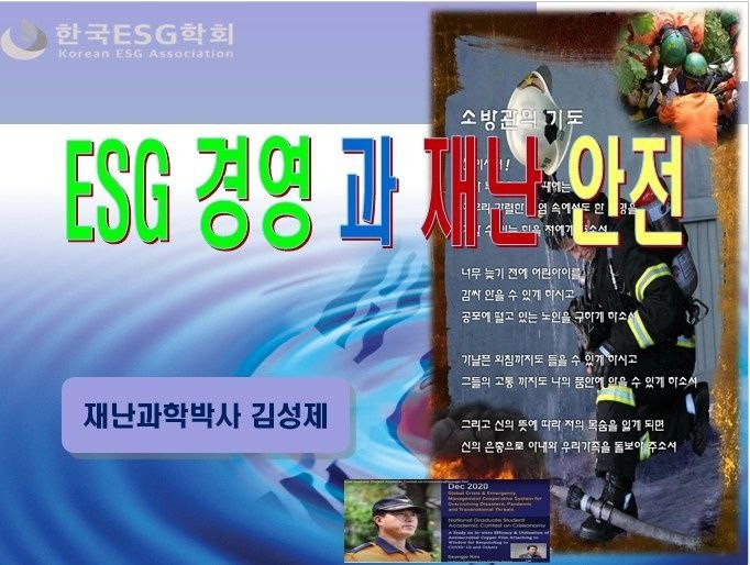 [세계타임즈 백진욱 기자] 지난달 31일(금) 김성제(인천119특수대응단, 건국대 안보재난관리학과 겸임교수)는 저녁시간 (사)한국ESG학회 및 ESG 경제연구소 초청 특별강연을 통해 위드&포스트 코로나시기에 ESG는 선택이 아니라 필수이며, ESG 안전경영은 매몰비용 (sunk cost)이 아니라 투자라며 강조했다.