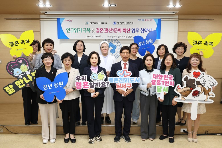 [달서구 세계타임즈=한윤석 기자] 대구 달서구(구청장 이태훈)는 대구광역시간호사회(회장 서부덕)와 초저출생 인구위기 극복을 위해 공동 대응하고,‘잘 만나보세’뉴(NEW) 새마을운동(결혼문화) 확산 등을 위한 업무 협약을 체결했다고 6일 밝혔다.