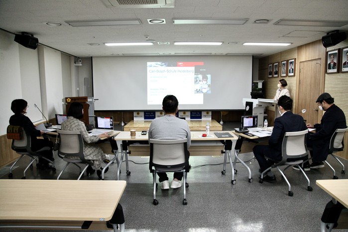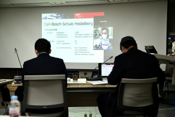[세종=세계타임즈 이채봉 기자] 세종특별자치시의회(의장 이태환) 교육안전위원회(위원장 박성수)는 지난 3일 의회청사 대회의실에서 독일 프랑크푸르트의 칼보쉬스쿨(Carl-Bosch Schule) 관계자와 함께 실시간 화상회의 프로그램을 활용한 ‘국외 온라인 의정 연수’를 진행했다.