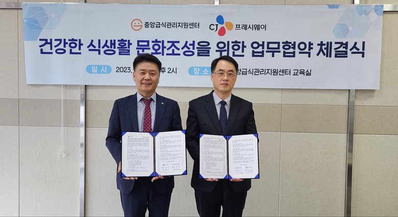 지난 10월 20일(금) 충북 청주시 중앙급식관리지원센터에서 강연중 CJ프레시웨이 영업본부장, 최상도 중앙급식관리지원센터장 등 관계자들이 참석한 가운데 업무협약을 체결했다.