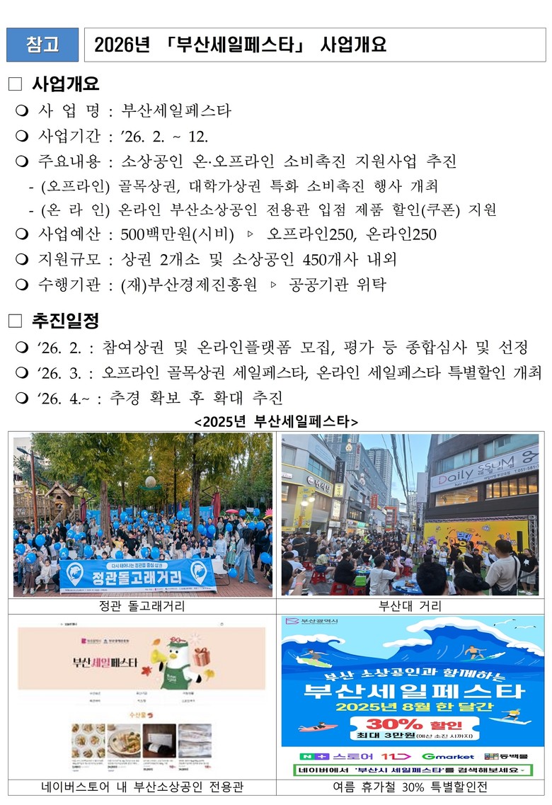 「부산세일페스타」는 소상공인 매출 증대와 민생경제 활력 제고를 위해 온오프라인에서 추진하는 소비 촉진 행사로, 골목상권·대학가 상권을 중심으로 특색 있는 소비 특화 프로그램을 운영하고, 대형 온라인 플랫폼 내 부산 소상공인 전용관을 구축해 할인 행사를 진행하는 방식으로 추진된다.