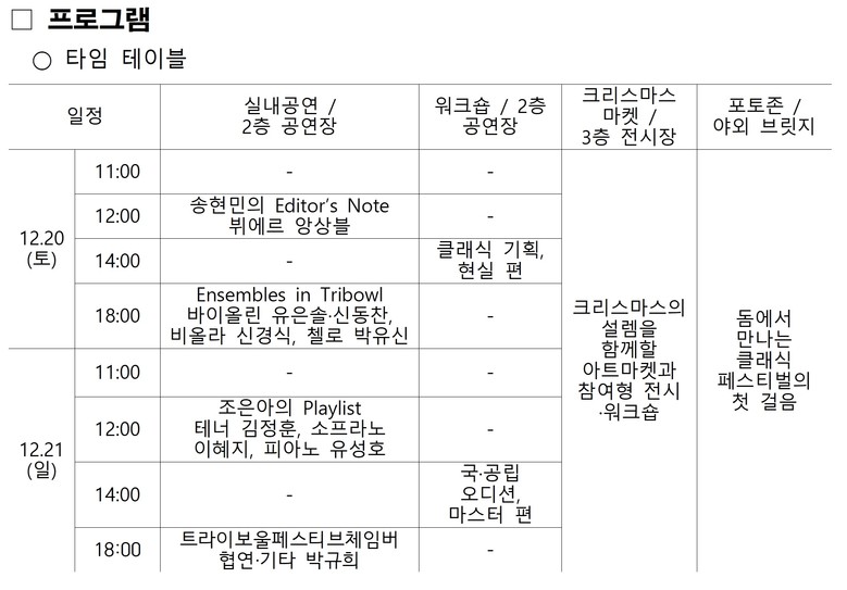 올해로 3회째를 맞는 클래식 페스티벌은 대중들에게 잘 알려진 차이코프스키의 ‘호두까기 인형 모음곡’ 중 일부, 르로이 앤더슨의 ‘썰매 타기’ 등 크리스마스 분위기를 물씬 느낄 수 있는 클래식 음악들이 다양한 구성을 통해 관객들을 만난다.