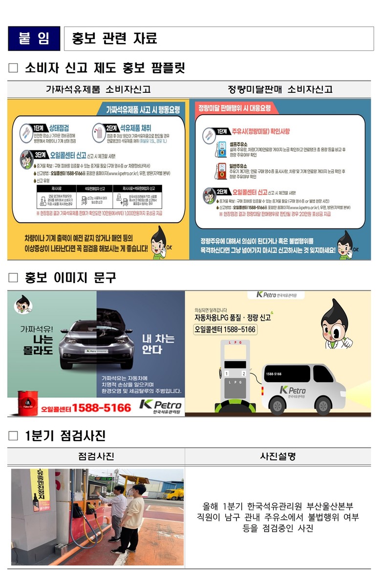 또 주유 후 이상 증상 발생, 가짜석유나 정량 미달 의심 등의 불법행위가 의심되면 한국석유관리원 소비자신고센터 등에 적극적으로 신고할 것을 홍보할 예정이다.