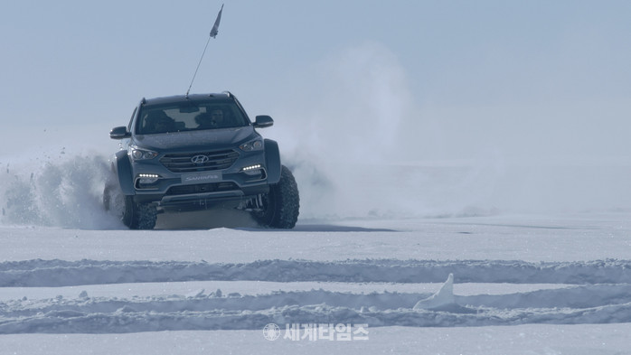 이번 남극 횡단에 이용된 싼타페 차량은 양산 중인 2.2 디젤 차량이다. 영하 28도까지 내려가는 극지 주행을 위해 38인치 타이어 교체, 지상고 상향에 따른 서스펜션 및 기어비 조정, 상시 시동을 위한 히팅 시스템, 전용 연료 탱크 장착 등을 개조했다.