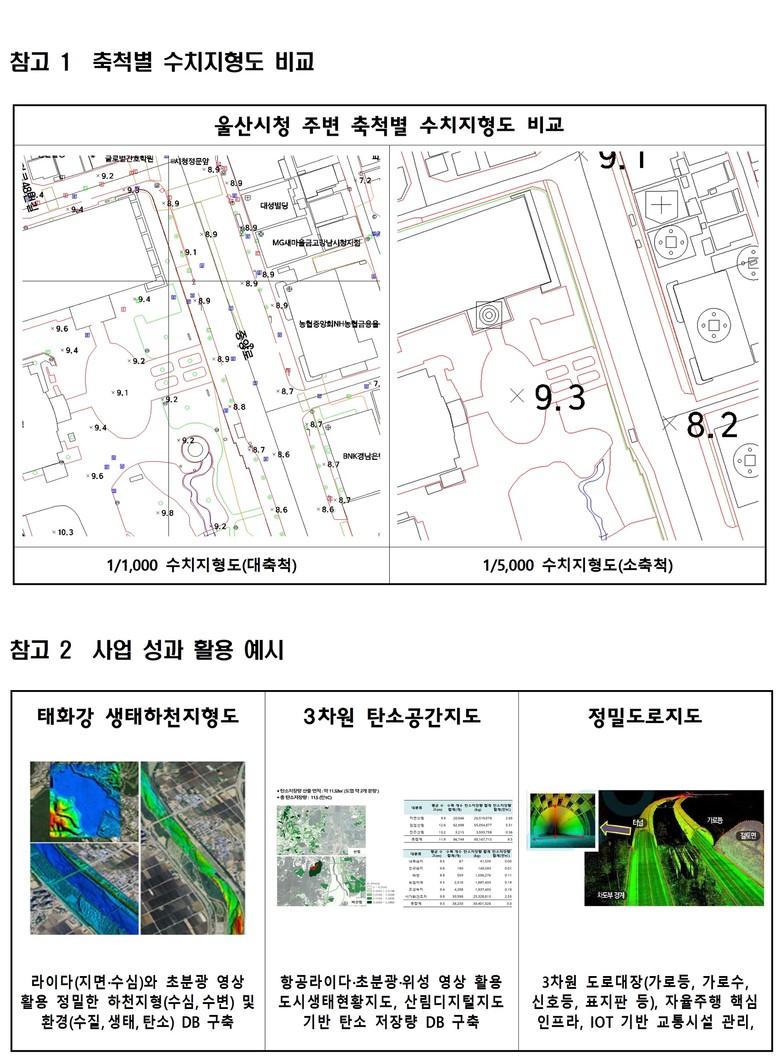 특히 반구천·태화강 일원과 개발제한구역을 대상으로 항공·드론 촬영 과 라이다(LiDAR), 모바일 맵핑 시스템(MMS), 초분광영상 등 첨단 기술)을 활용해 △태화강 생태하천지형도 △탄소공간지도 △정밀도로지도 △3디(D) 건물·수목 모형 등의 기초 공간정보를 구축한다.