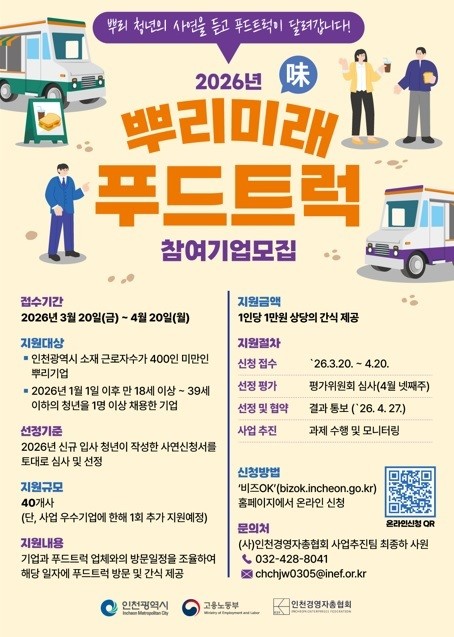 신청은 인천기업지원 종합 플랫폼 ‘비즈OK(bizok.incheon.go.kr)’를 통해 온라인으로 접수할 수 있다. ‘푸드트럭’ 사업은 3월 20일부터 4월 20일까지, ‘일할맛남(식단 개선)’ 사업은 3월 23일부터 4월 22일까지 각각 신청 가능하다.