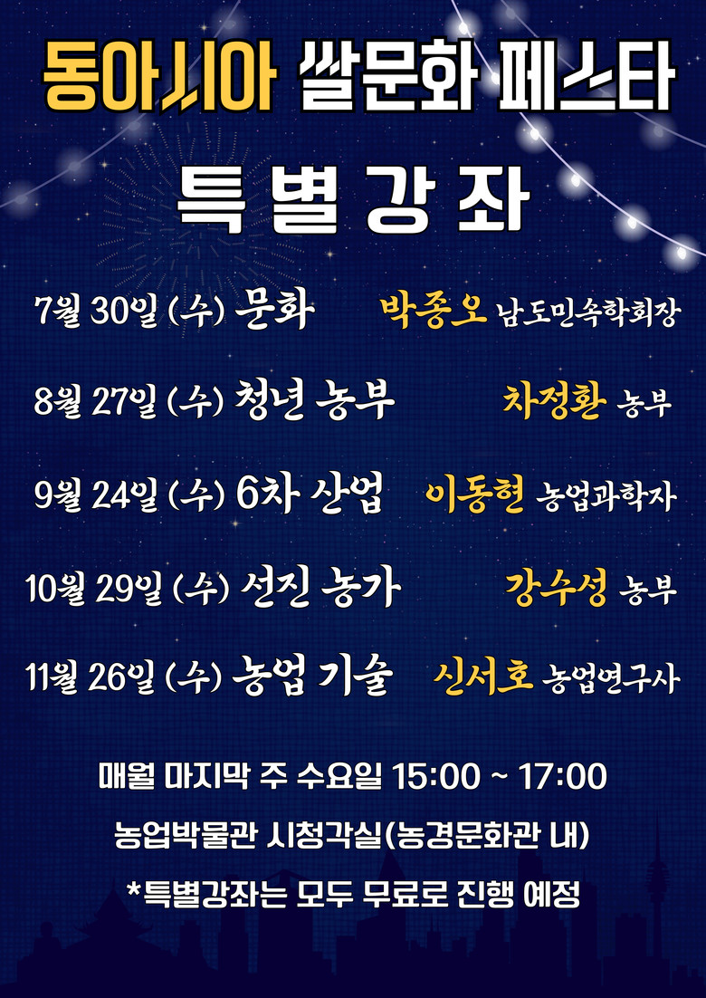 강좌는 전남도농업박물관 특별기획전 ‘동아시아의 미, 쌀 문화’와 연계, 전시를 통해 확인할 수 있는 동아시아 농경문화의 맥락을 더욱 깊이 있게 이해하는 기회를 제공할 것으로 기대된다.