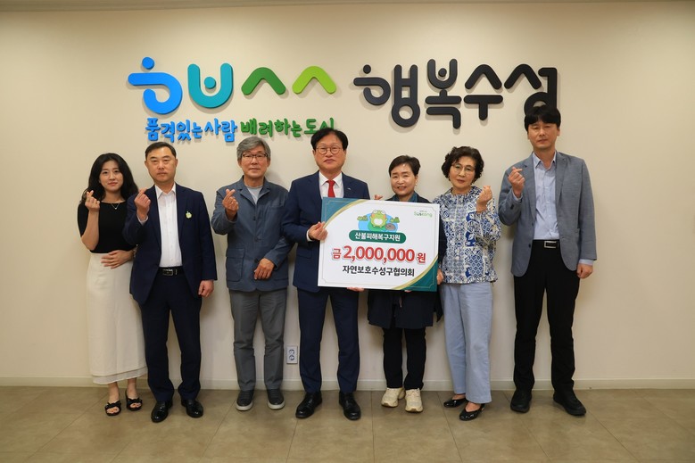 김대권 수성구청장은 “평소 자연보호에 솔선수범하며 지역사회의 귀감이 되어주신 자연보호수성구협의회가 이웃을 위한 나눔에도 앞장서 주셔서 깊이 감사드린다”며 “성금이 피해 지역 주민들에게 큰 힘이 되길 바란다”고 말했다.