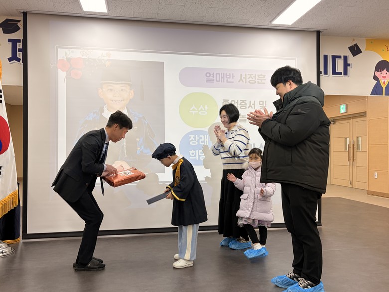 졸업장 수여는 차분하고 따뜻한 분위기 속에서 이루어졌으며, 유아 한 명 한 명의 성장을 응원하는 의미를 담아 진행되었다. 아이들의 밝은 표정과 당당한 모습은 지난 유치원 생활을 잘 마무리했음을 보여주었다.