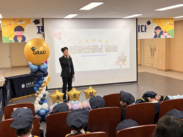 산동초등학교병설유치원 원장은 “유치원에서의 경험이 아이들에게 즐거운 추억이자 새로운 도전을 향한 힘이 되길 바란다”고 축사를 전하며 보호자들에게도 그동안의 신뢰와 지원에 감사 인사를 전했다.