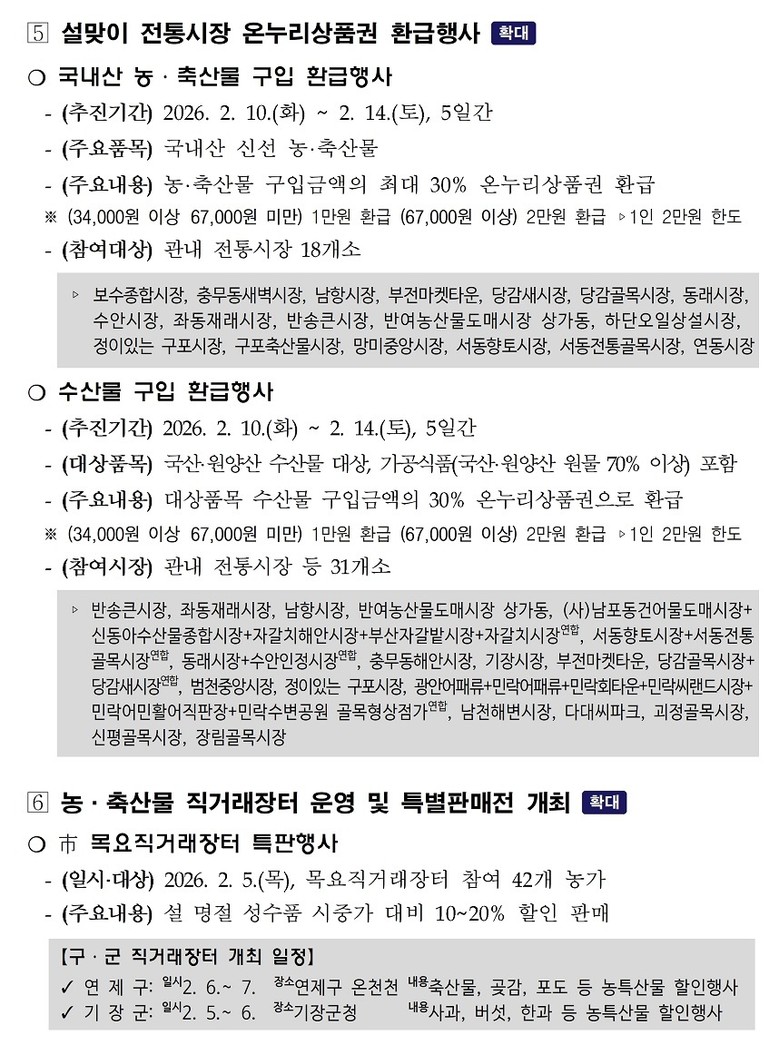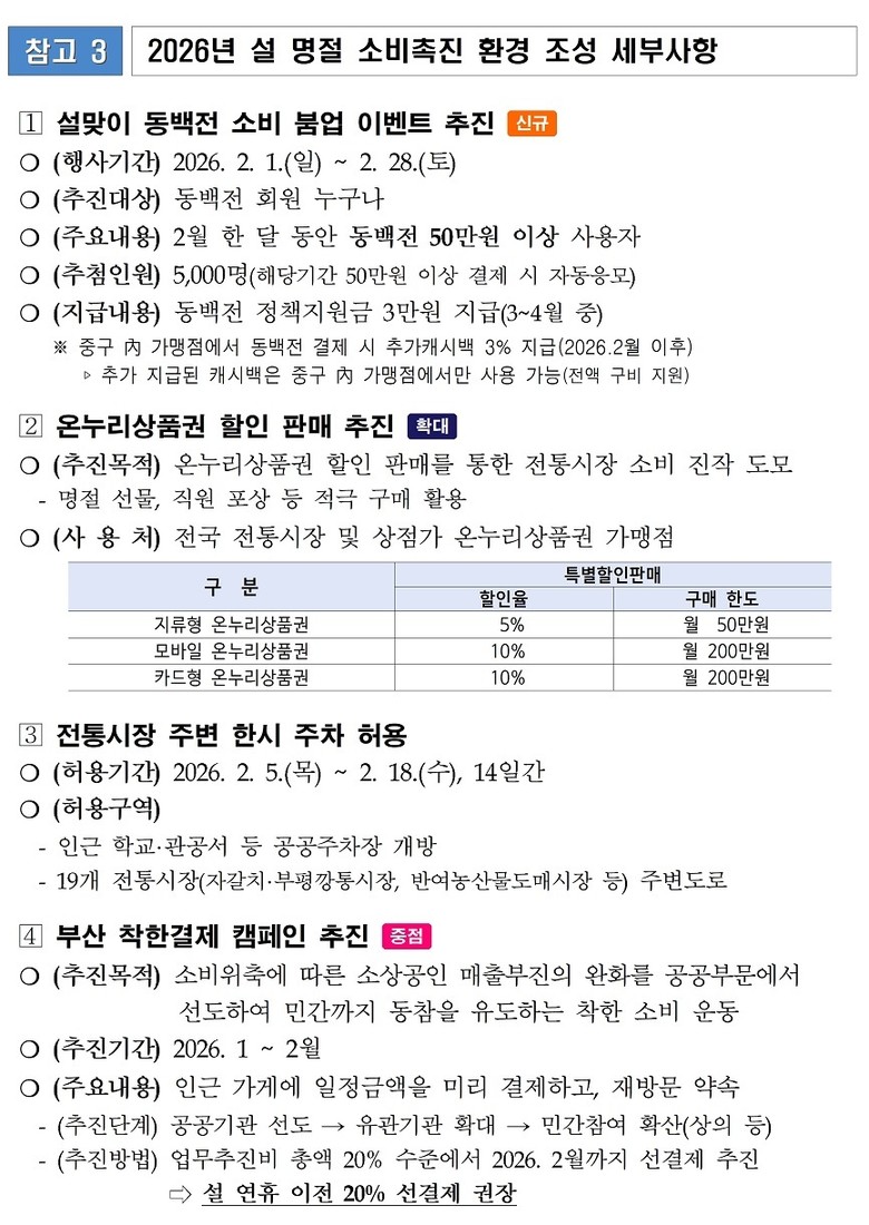 [민생경제] ▲동백전 소비 붐업 이벤트(동백전 50만 원 이상 사용자 5천 명 추첨, 정책지원금 3만 원 지급) ▲전통시장 온누리상품권 할인 판매(최대 10%) ▲온누리상품권 환급행사(최대 2만 원) ▲중소기업 소상공인 대상 정책자금(2천400억 원) 조기 공급 등 지역 소비진작과 민생경제회복을 도모하고, 시와 구·군, 유관기관이 협조체계를 구축해 물가대책종합상황실 운영으로 설 물가 안정에 총력을 다한다.