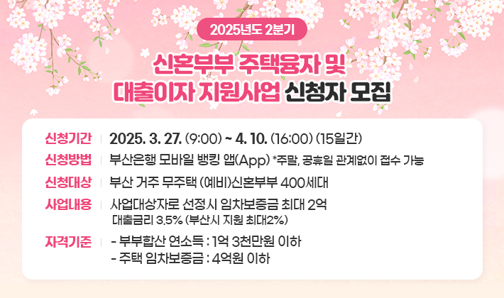 지원을 희망하는 시 거주 무주택 신혼부부는 오늘(27일) 오전 9시부터 4월 10일 오후 4시까지 부산은행 모바일 뱅킹 앱을 통해 신청할 수 있다.