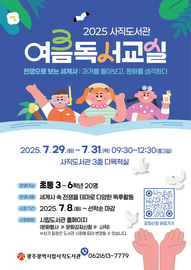 - 사고력·표현력 기르는 맞춤형 프로그램…8일부터 선착순 접수 [광주 세계타임즈=손권일 기자] 광주광역시(시장 강기정)는 여름방학을 맞아 시립도서관 3곳에서 초등학생을 대상으로 하는 체험형 독서 프로그램인 ‘여름독서교실’을 29일부터 31일까지 운영한다.