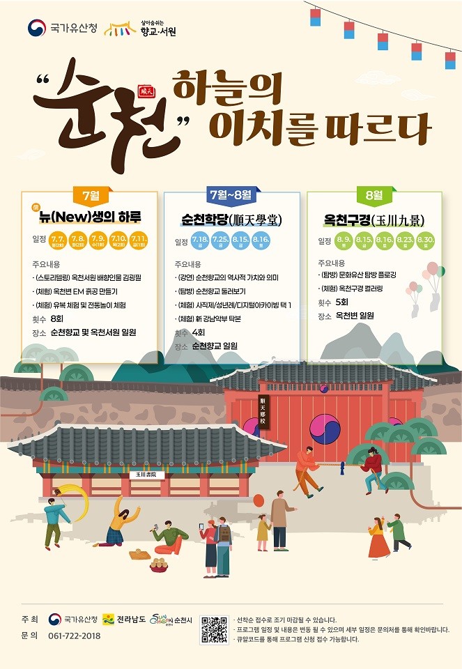 이번 프로그램은 ‘순천, 하늘의 이치를 따르다’라는 주제로, ▲순천학당 ▲ 뉴(New)생의 하루 ▲옥천구경 등 총 3가지 테마로 구성돼 시민들이 직접 보고, 듣고, 체험하며 유산의 가치를 느낄 수 있도록 기획됐다.