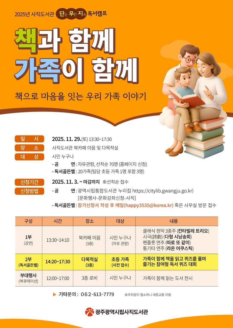 참가 신청은 시민 누구나 할 수 있으며, 광주광역시립통합도서관 누리집(https://citylib.gwangju.go.kr)의 문화행사→문화강좌 신청→사직도서관 메뉴에서 하면 된다. ‘독서골든벨’ 참여를 희망하는 가족은 참가신청서를 전자우폄(happy3535@korea.kr) 또는 사직도서관 사무실로 방문해 신청하면 된다. 자세한 사항은 도서관 누리집을 참고하면 된다.