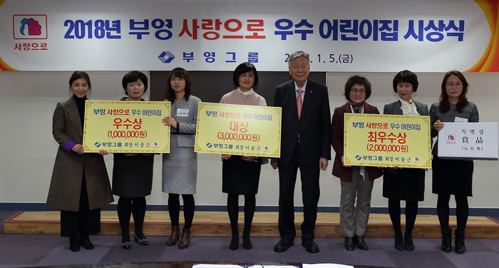 부영그룹(회장 이중근)은 5일 부영태평빌딩 7층 회의실에서 ‘2018년 어린이집 원장회의 및 시상식'을 열고, “부영 사랑으로 어린이집" 가운데 지난해 가장 모범적으로 ‘안심 어린이집’을 실천한 ‘익산배산2차 부영 사랑으로 어린이집(원장 채미영)’을 대상으로 선정했다”고 밝혔다.
