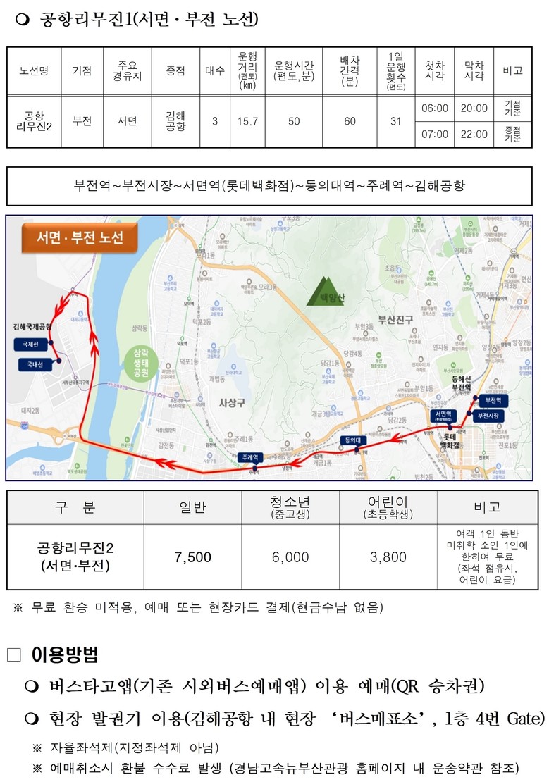 이용 요금은 성인 기준으로 ▲'공항리무진1(해운대·기장)' 9천5백 원 ▲'공항리무진2(서면·부전)' 7천5백 원이며, 다른 대중교통과의 무료 환승은 적용되지 않는다.