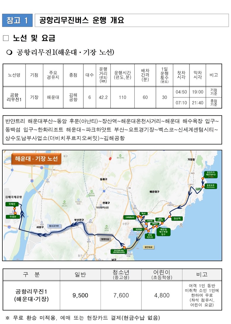 ‘공항리무진1(해운대·기장)’은 기장의 반얀트리해운대부산에서 도시철도 장산역, 해운대해수욕장, 한화리조트해운대 앞 등을 지나 광안대로를 통과해 김해공항을 오간다.
