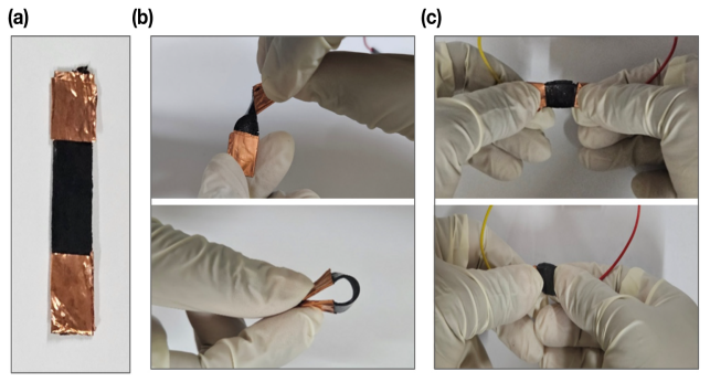 | ▲ (그림 설명) 제작된 밀웜 껍질 유래 키토산–글리세롤–흑연 복합소재 호흡 모니터링 센서. 기존 호흡 측정 장비보다 간단하고, 피부에 부드럽게 밀착되며, 실시간 데이터 수집이 가능하다. |