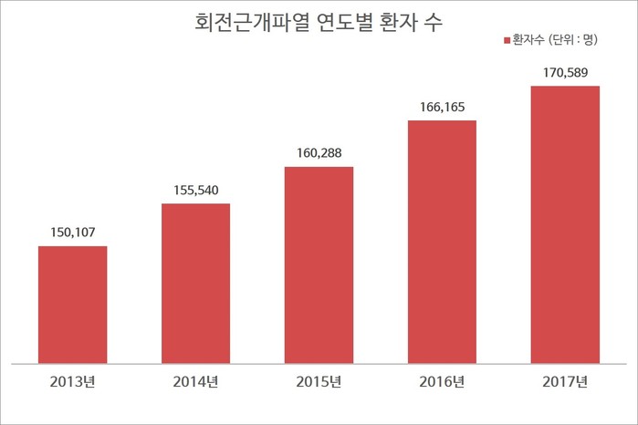 건강보험심사평가원의 통계 자료에 따르면 ‘어깨 및 위팔 부분의 근육 및 힘줄의 손상’, 즉 ‘회전근개파열’로 병원을 찾은 환자는 △2013년 15만107명, △2014년 15만5540명, △2015년 16만288명 △2017년 17만689명으로 매년 약 5000여 명 가량 증가하고 있다. 환자 수는 이같이 늘고 있는데 회전근개파열에 대한 인식은 부족하다.
