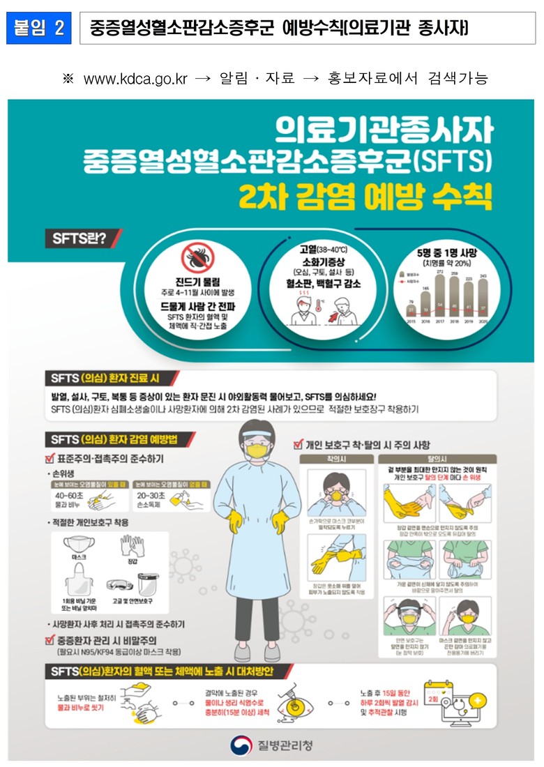 중증열성혈소판감소증후군(SFTS)은 바이러스를 보유한 참진드기에 물려 발생하며, 잠복기 4~15일을 거쳐 고열·구토·설사 등이 나타난다. 예방 백신이 없어 치명률이 18.5%로 높아 예방수칙 준수와 환자 조기인지 및 적기 치료 등 각별한 주의가 요구된다.